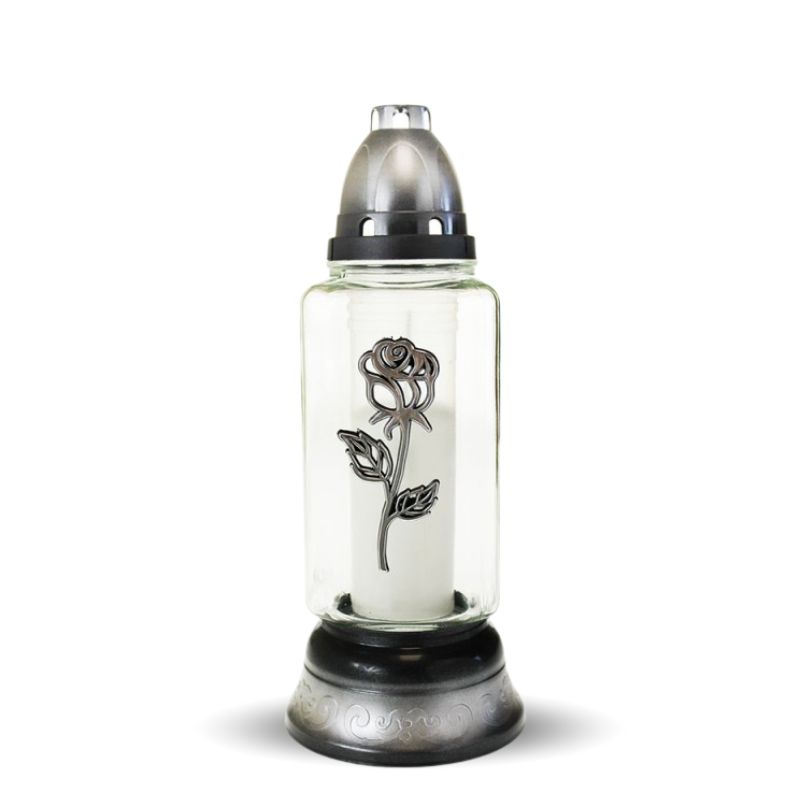 s parafinskim vložkom je visoka in elegantna steklena sveča z motivom vrtnice in srebrnim ohišjem. Vsebuje vložek G-230, za bolj trajnostno rešitev predlagamo elektronsko trajno lučko ali elektronski modul. Steklena nagrobna sveča S-119 z vrtnico je primerna za vse vremenske razmere.