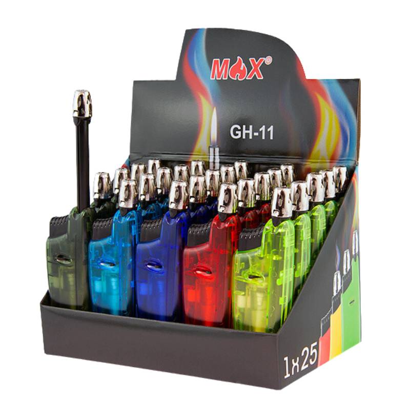 Vžigalnik teleskopski prozorni za sveče z izvlečno cevjo z ventilom za ponovno polnjenje. Na voljo v 5 različnih barvah.
